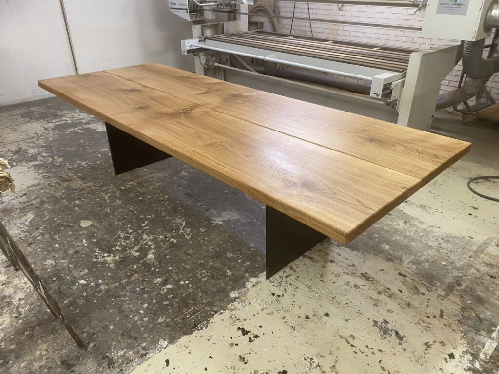 DETTE FLOTTE BORD ER SOLGT.MEN VI HAR PLANKER TIL AT LAVE FLERE. STORT KRAFTIG FLOT MEGET RUSTIKT PLANKEBORD BORD Pris 31995,00 KR AFH. Plankebord eg natur olieret EKSTRA KRAFTIGE PLANKER 52 MM OG MASSIVT METAL UNDERSTEL SORT MAT LAKERET L 400/300 cm B 110 cm T 5,2 cm .