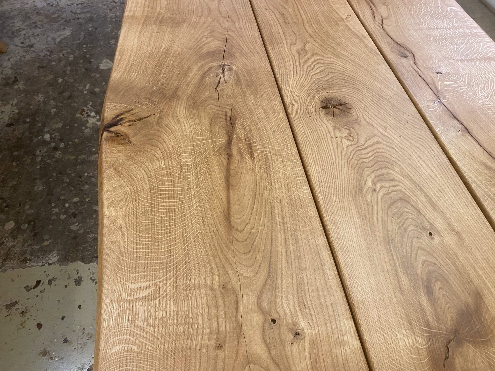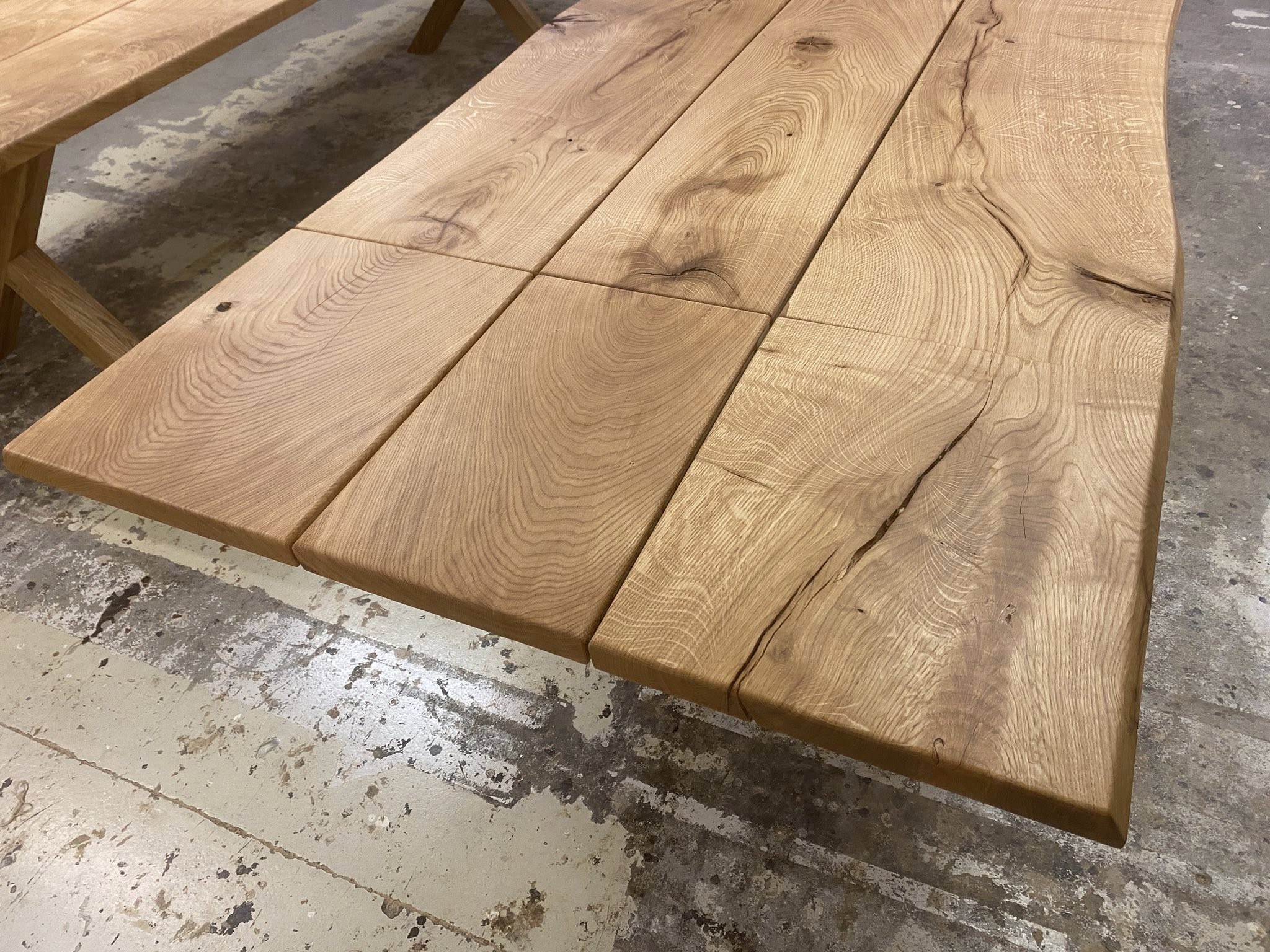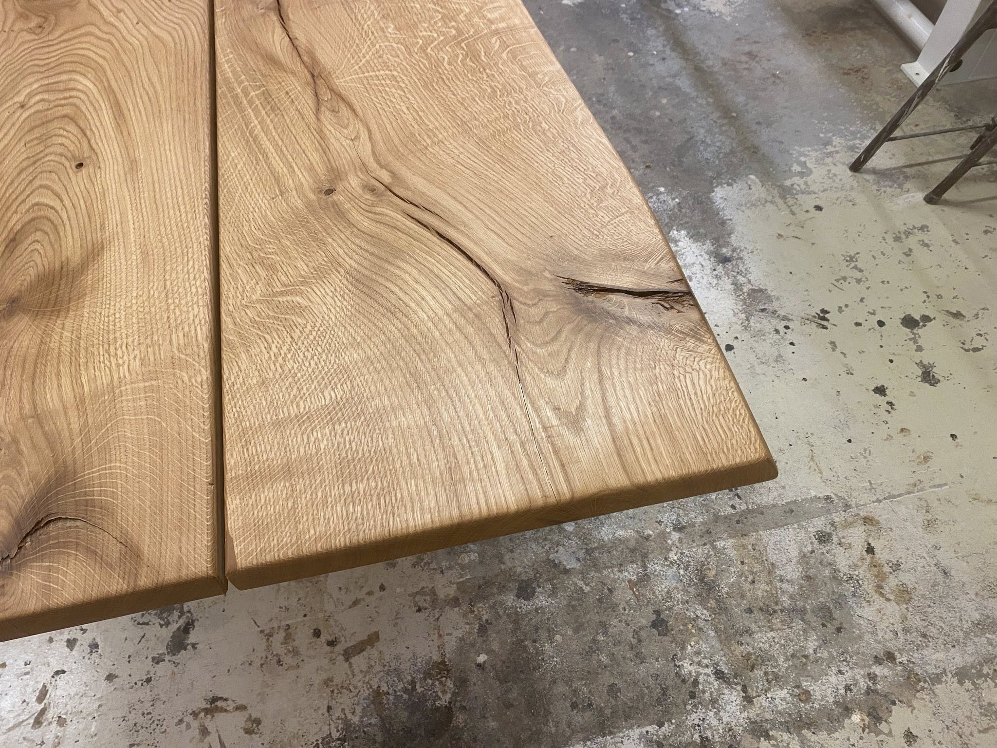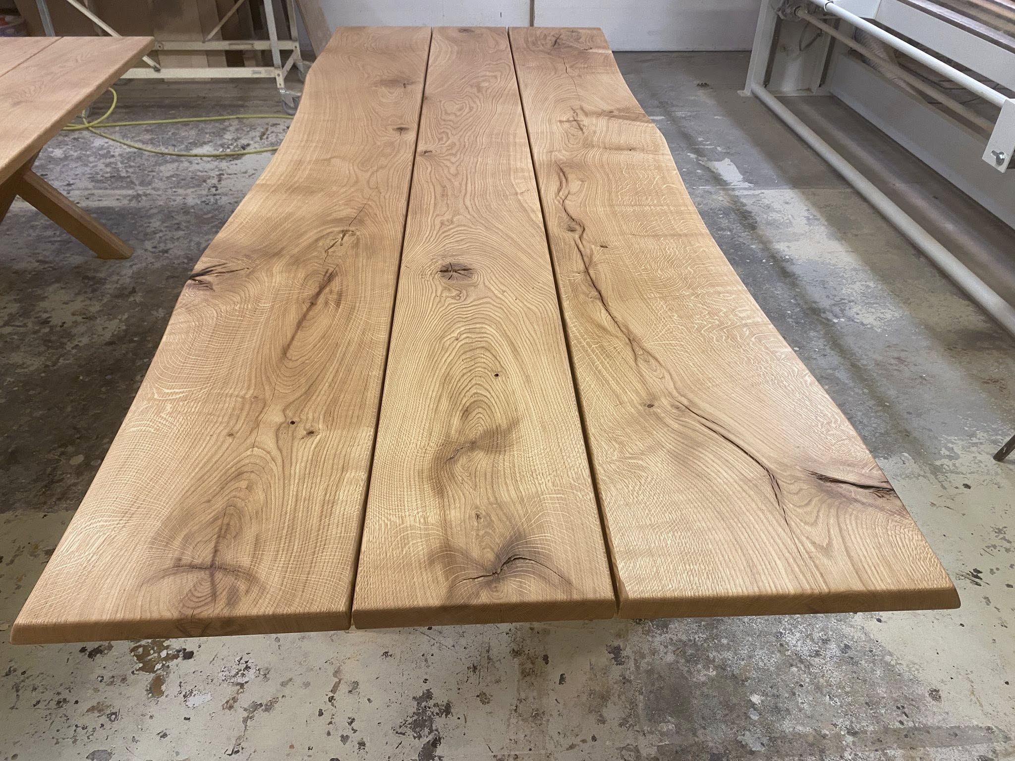 FINT MEGET RÅT OG RUSTIKT PLANKEBORD EG NATUR OLIERET. L 350/300 CM B 110 CM T 4 CM.