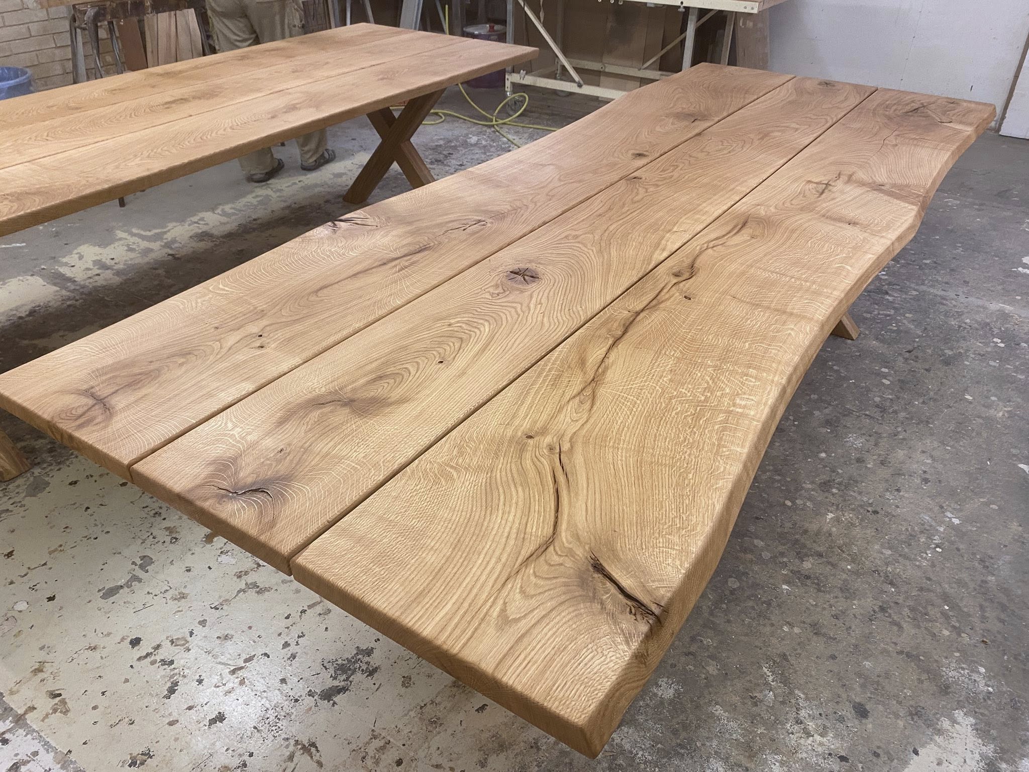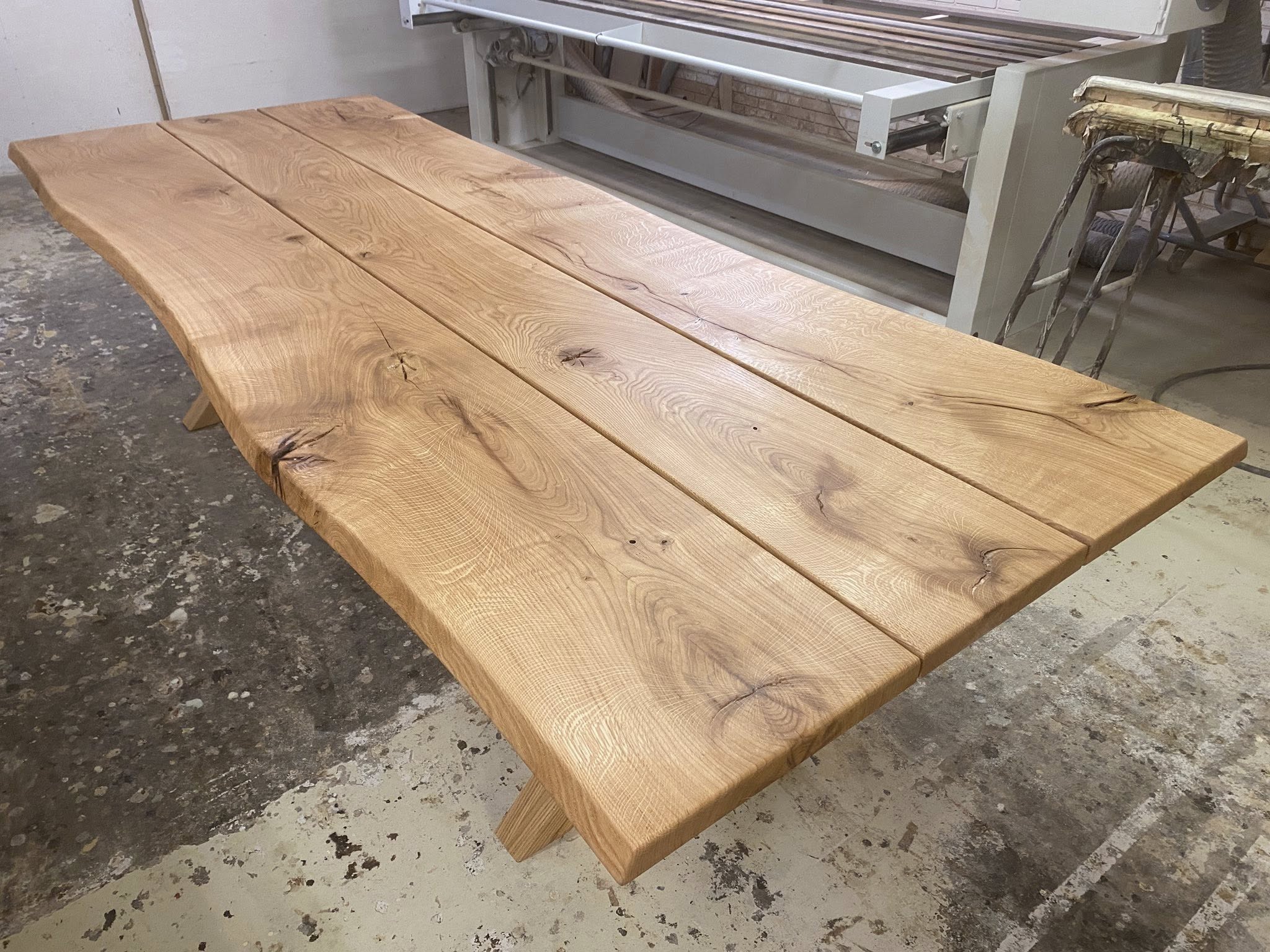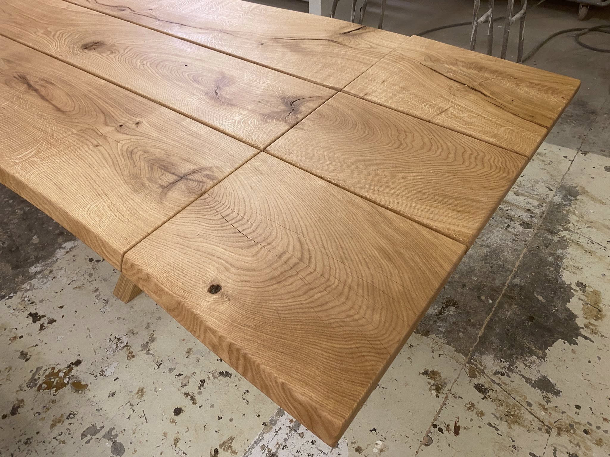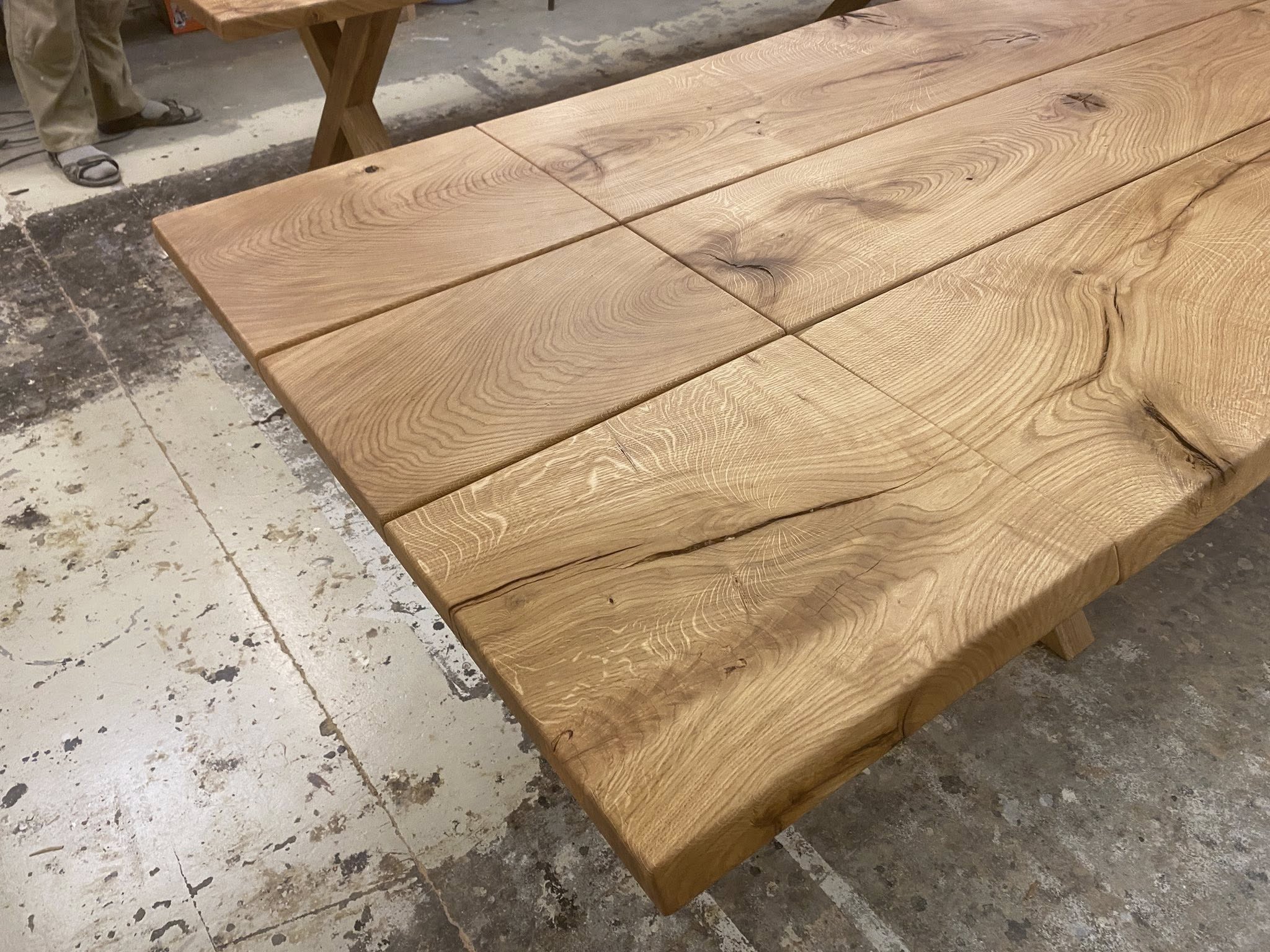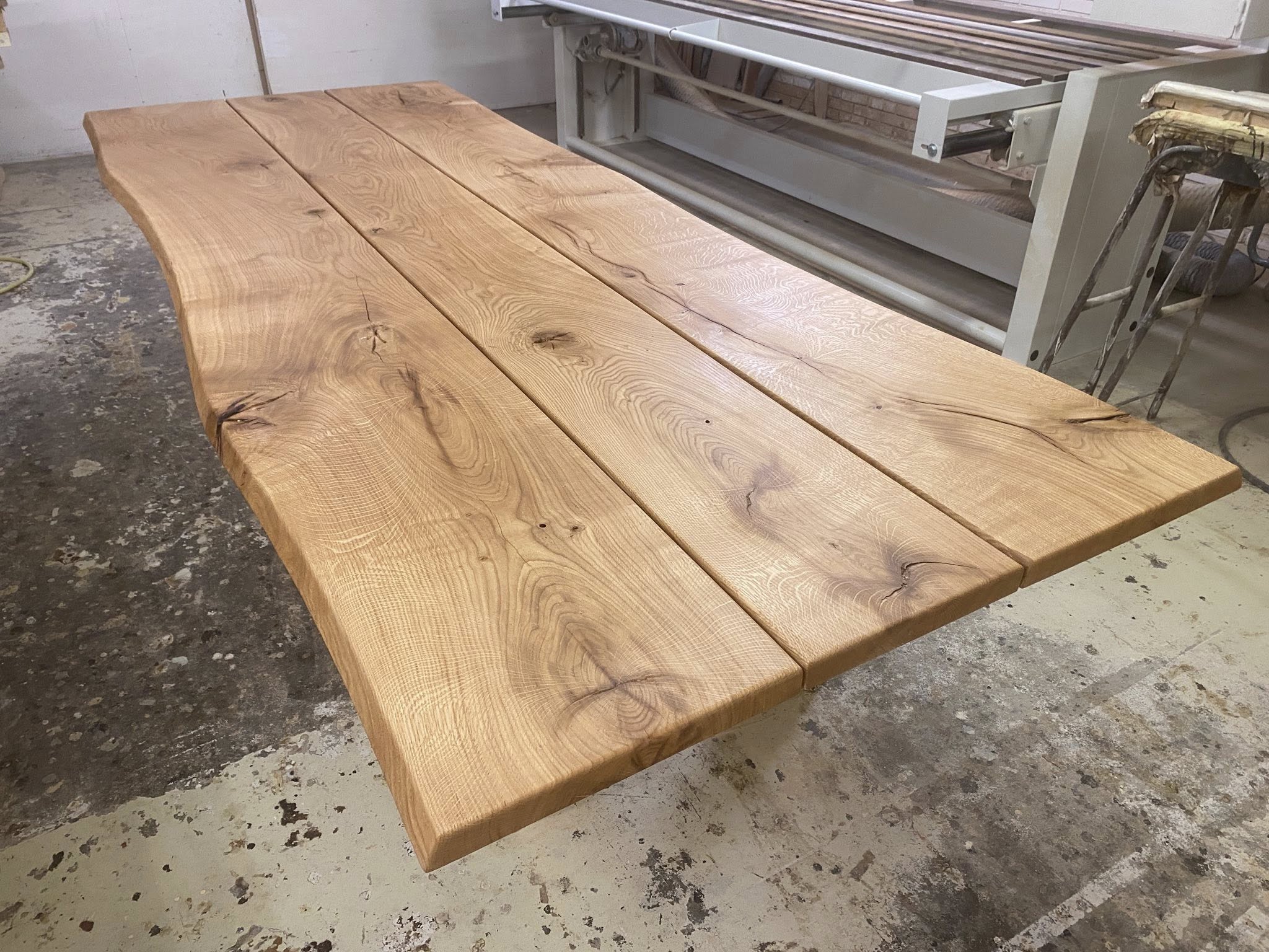 FINT MEGET RÅT OG RUSTIKT PLANKEBORD EG NATUR OLIERET. L 350/300 CM B 110 CM T 4 CM.