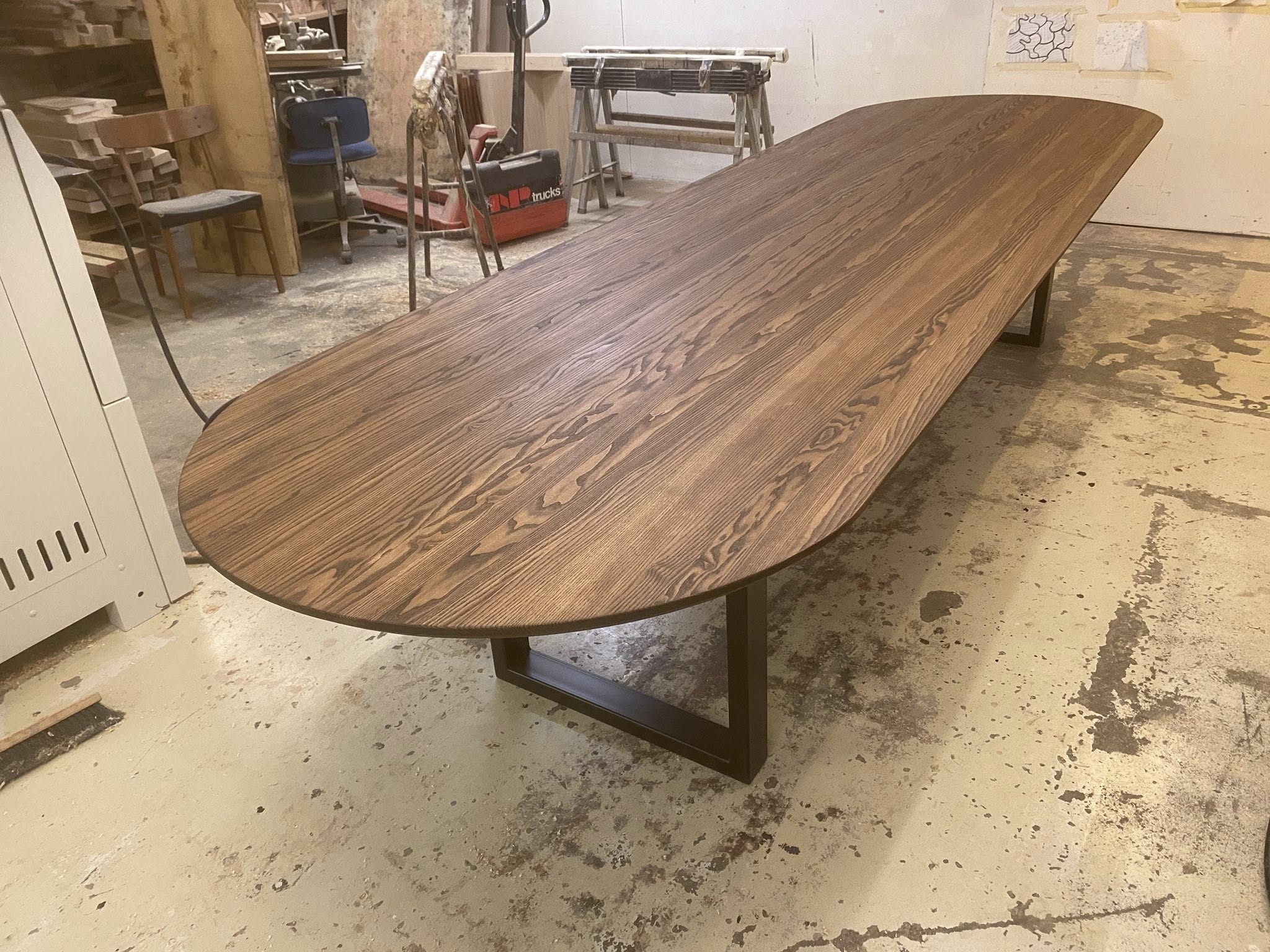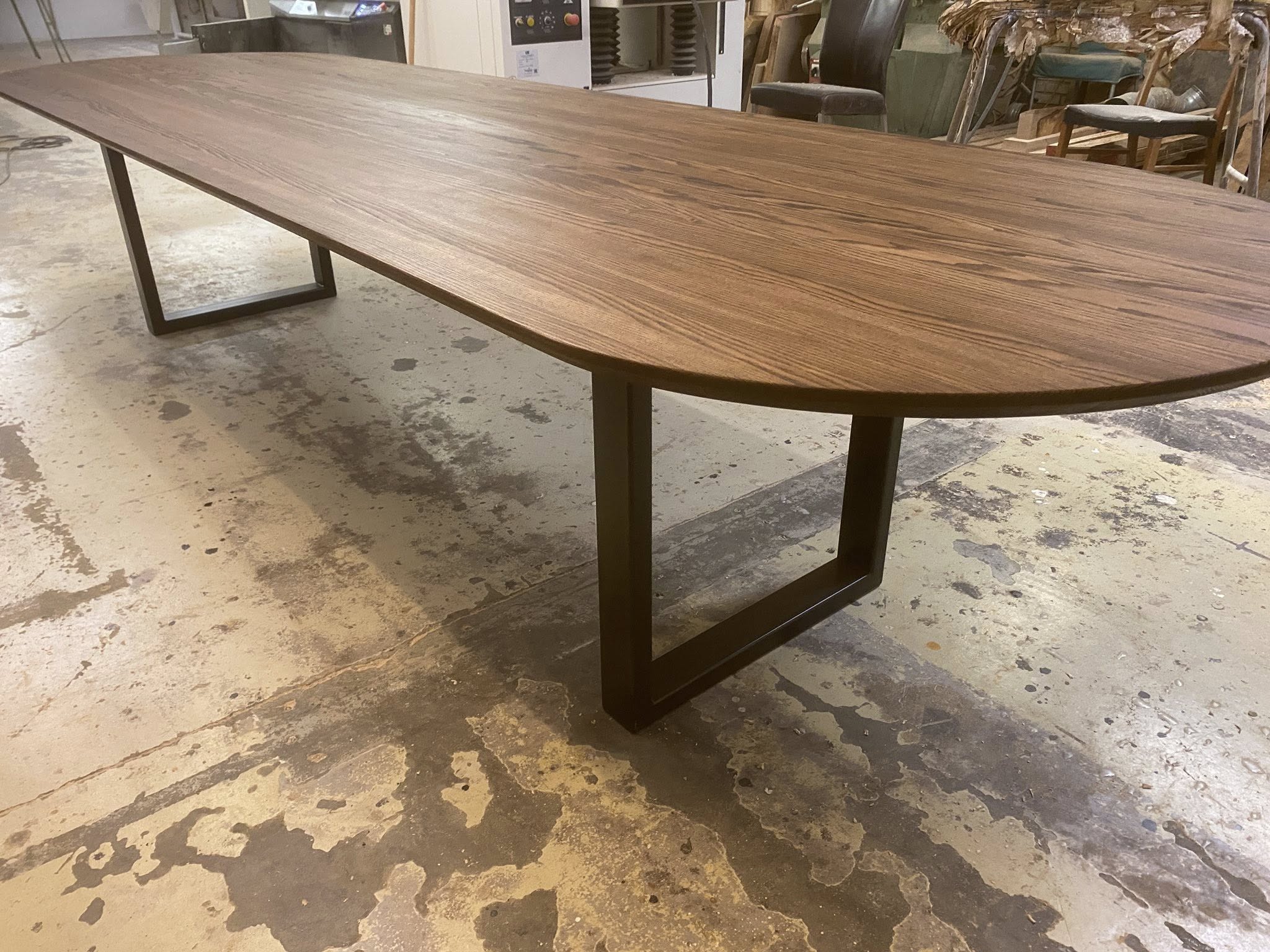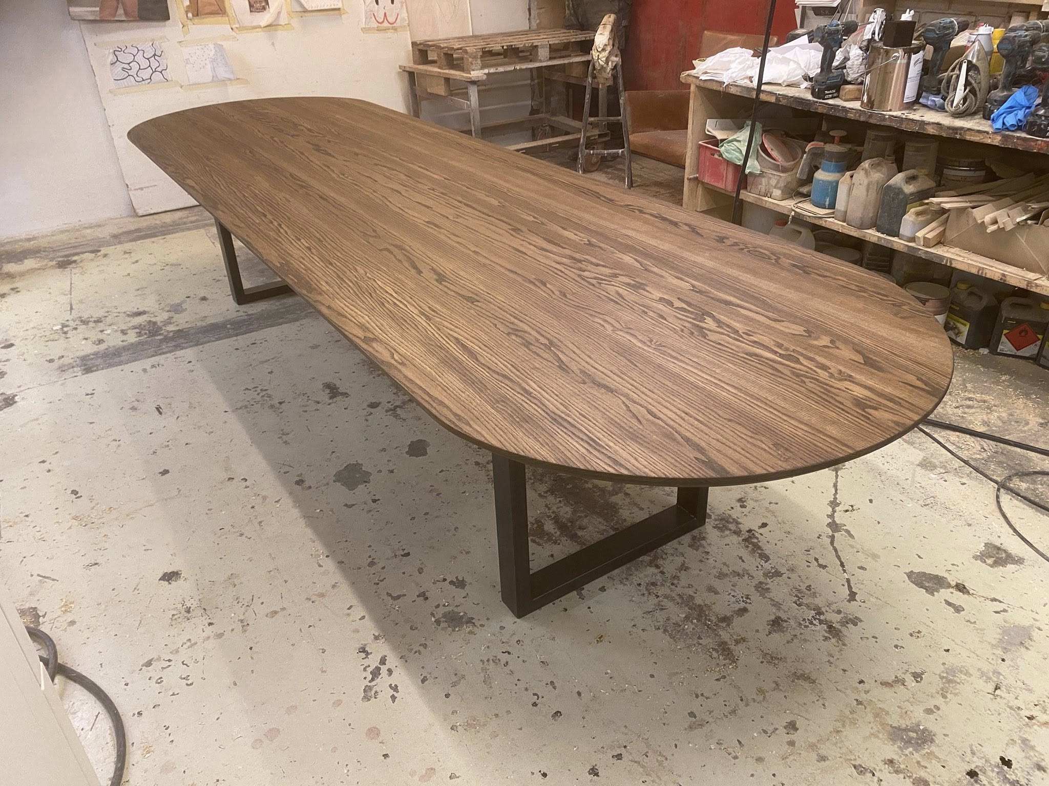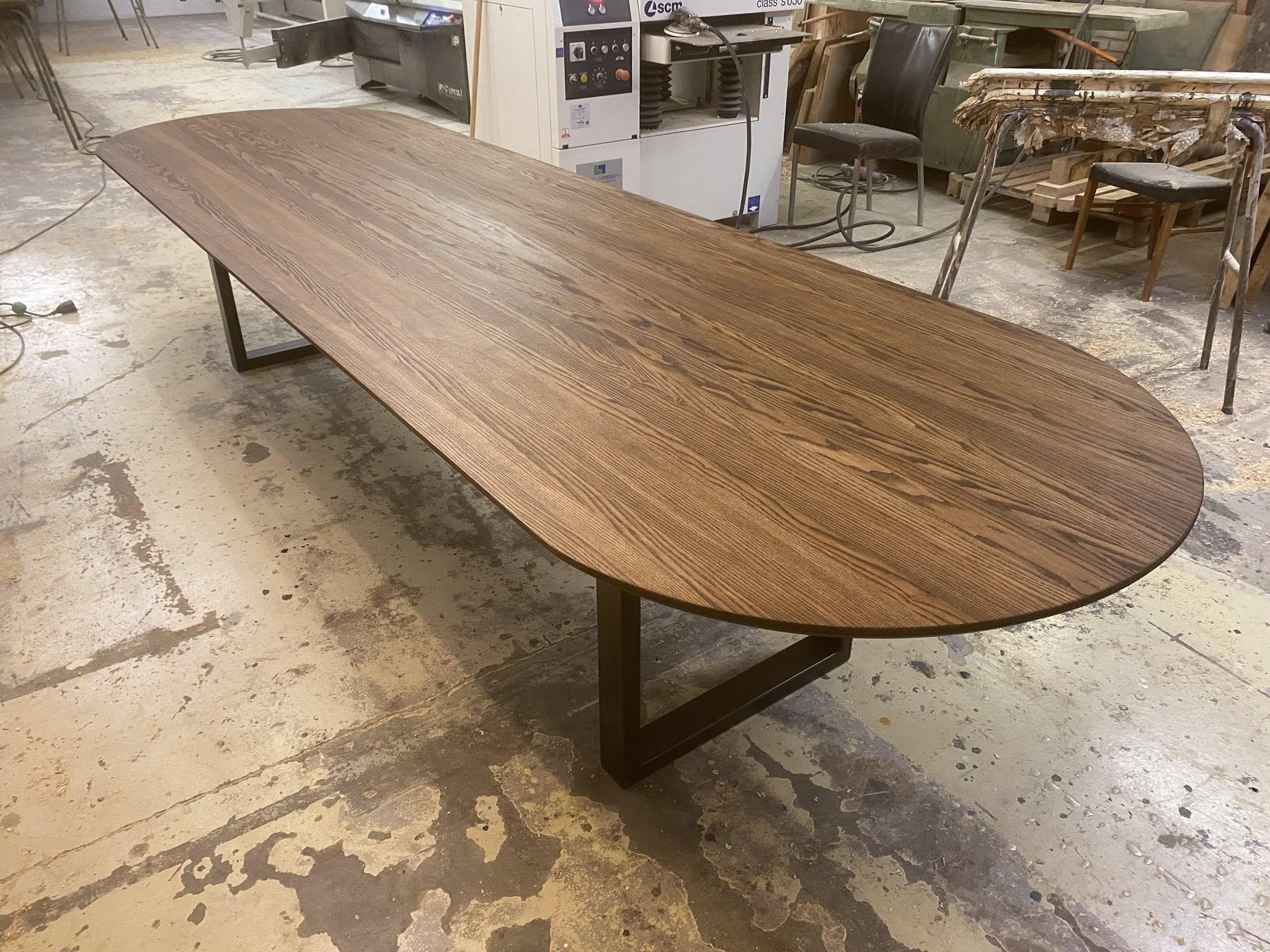 Virkelig flot langbord i ASK stavlimet med gennemgående stave. Bordet er brun olieret hvilket givere den varme glød. Bordet kan leveres med forskellige understel efter ønske. Bordet kan leveres i længder op til ca. 400 cm og bredder op til ca 130 cm. Bordet kan leveres i en matlakeret udgave hvilket giver en vedligeholdelsesfri overflade. Bordet kan også leveres i andre farver hvis det ønskes. Dette bords dimensioner er L 360 B 105 cm T 3 cm .