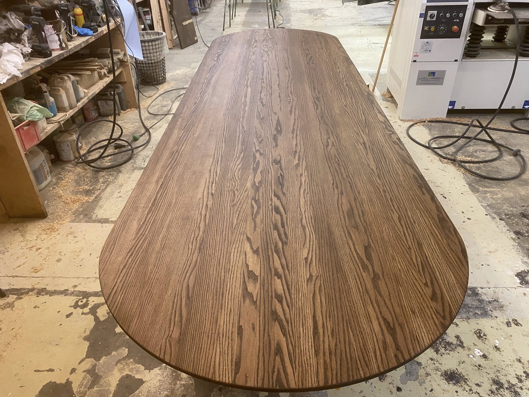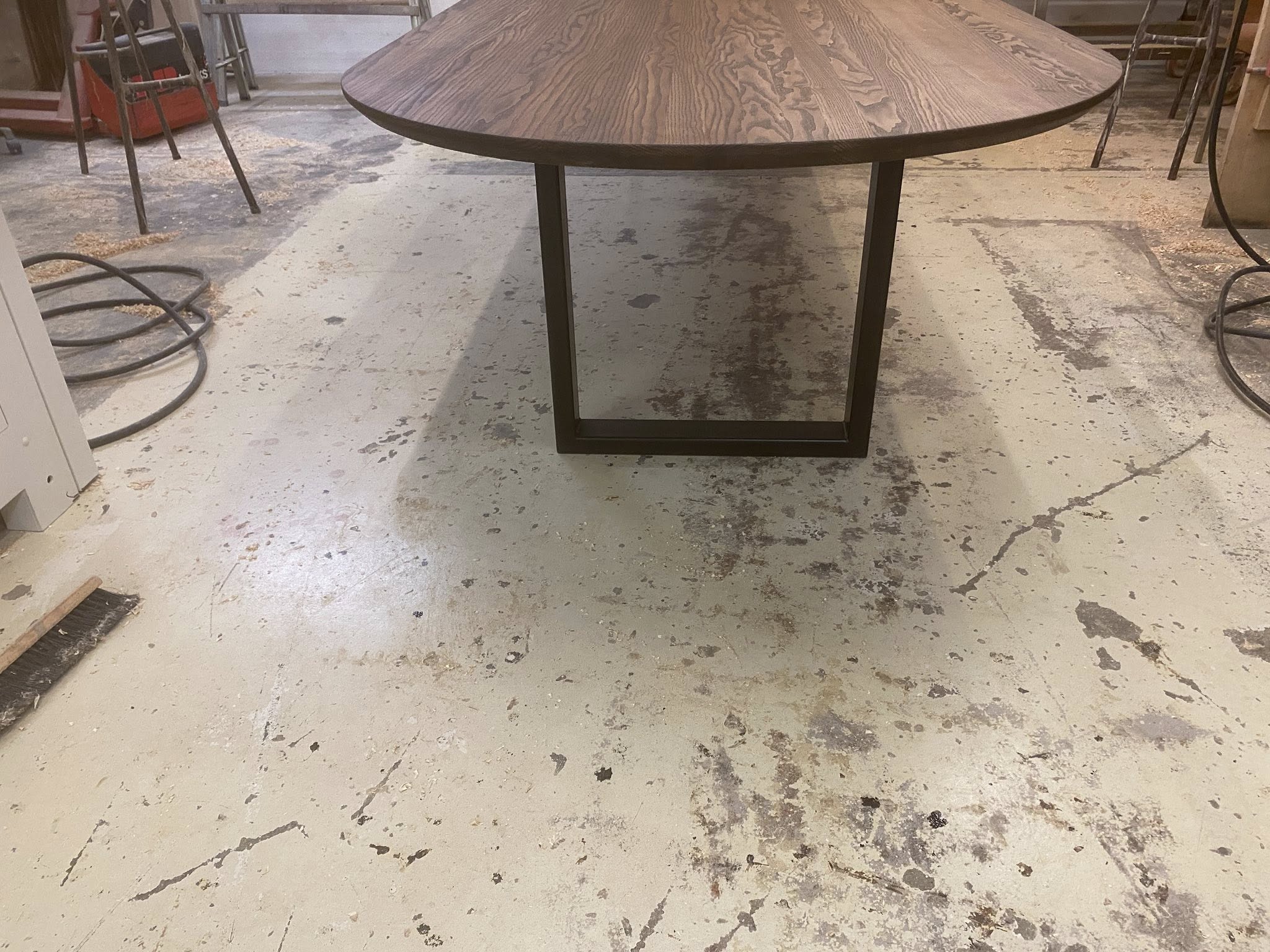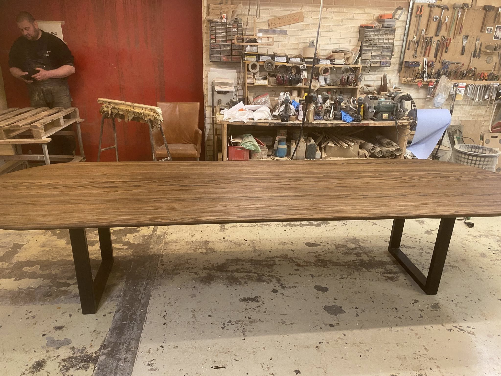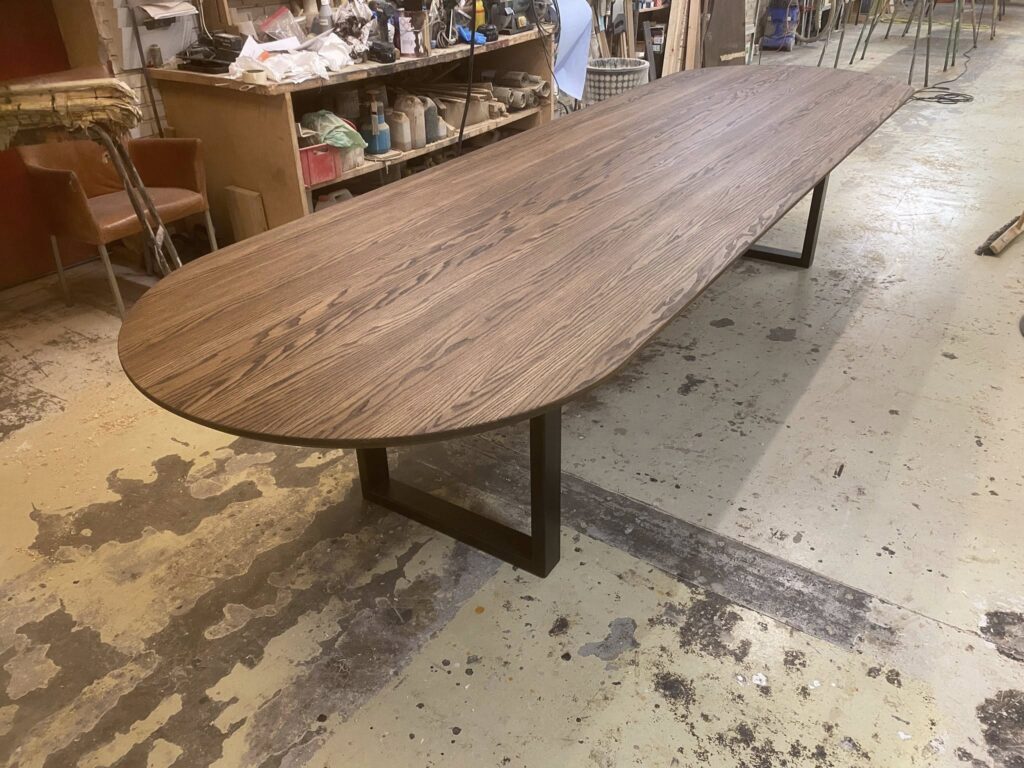 Virkelig flot langbord i ASK stavlimet med gennemgående stave. Bordet er brun olieret hvilket givere den varme glød. Bordet kan leveres med forskellige understel efter ønske. Bordet kan leveres i længder op til ca. 400 cm og bredder op til ca 130 cm. Bordet kan leveres i en matlakeret udgave hvilket giver en vedligeholdelsesfri overflade. Bordet kan også leveres i andre farver hvis det ønskes. Dette bords dimensioner er L 360 B 105 cm T 3 cm .