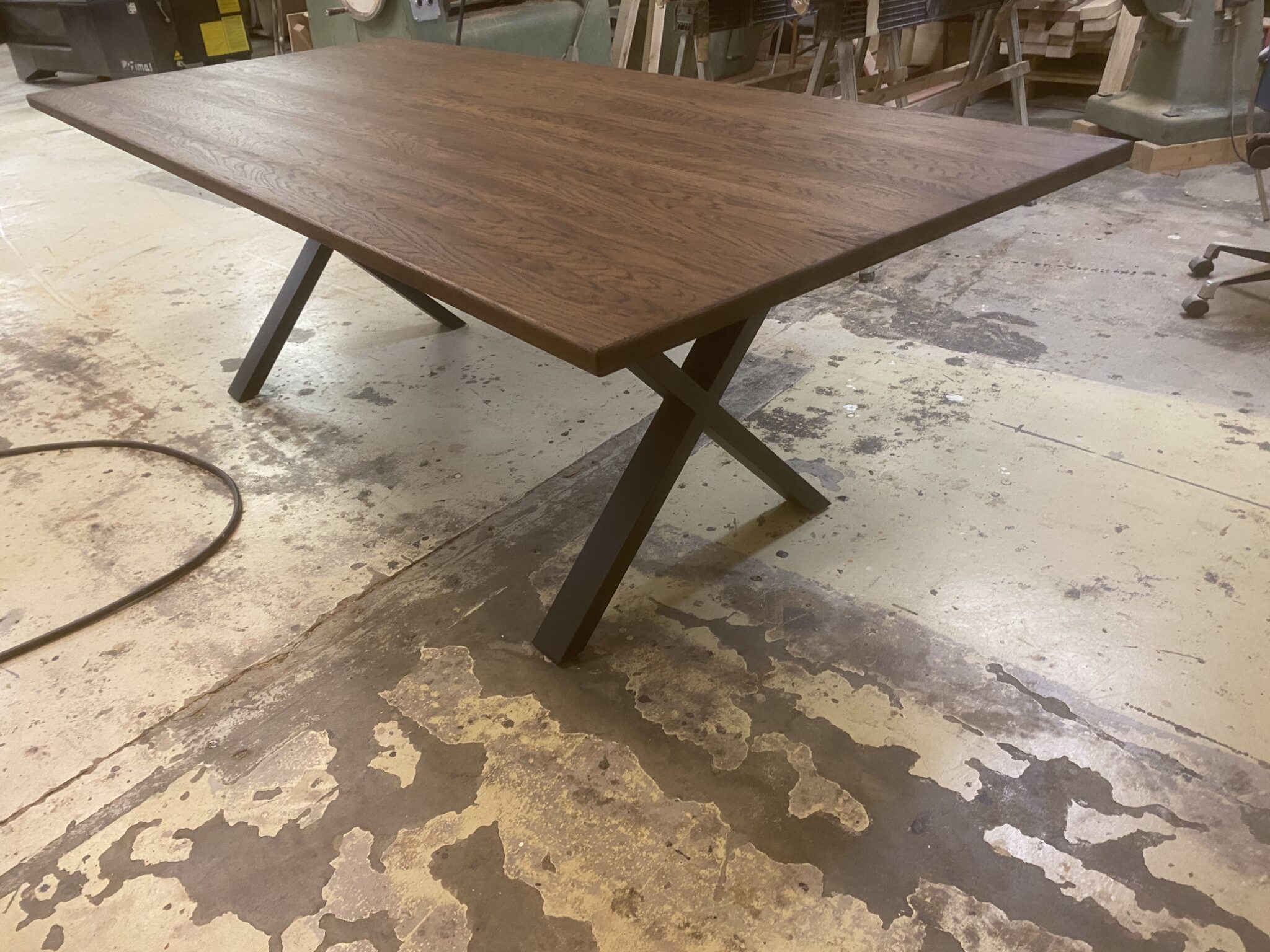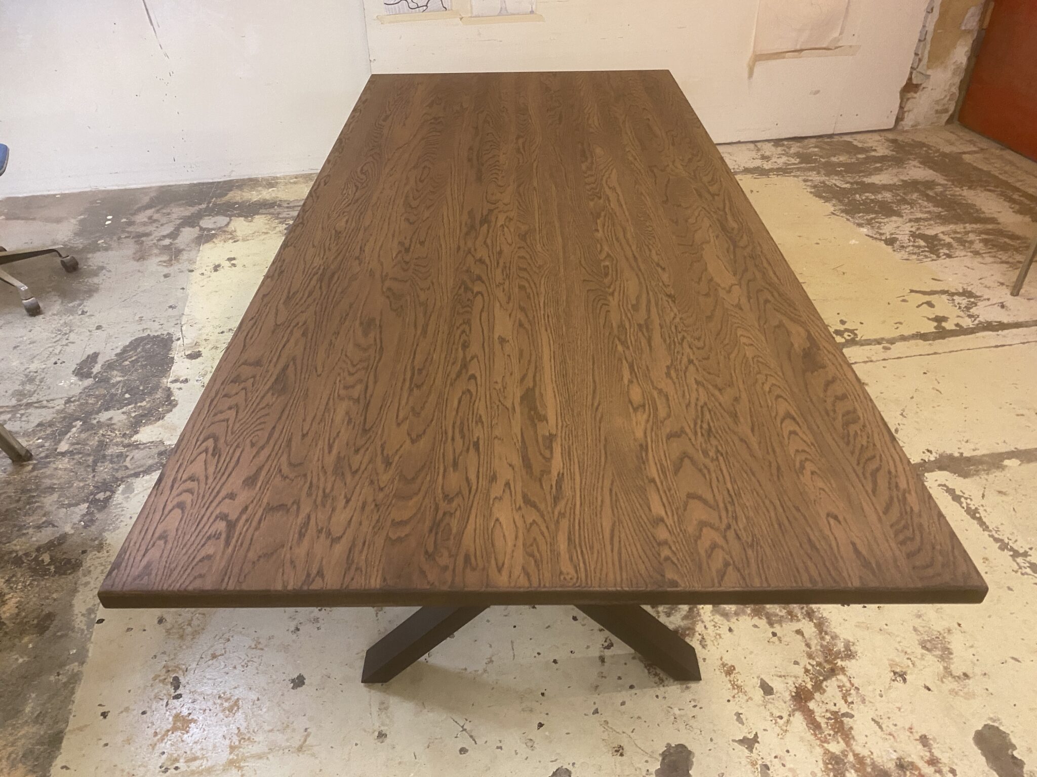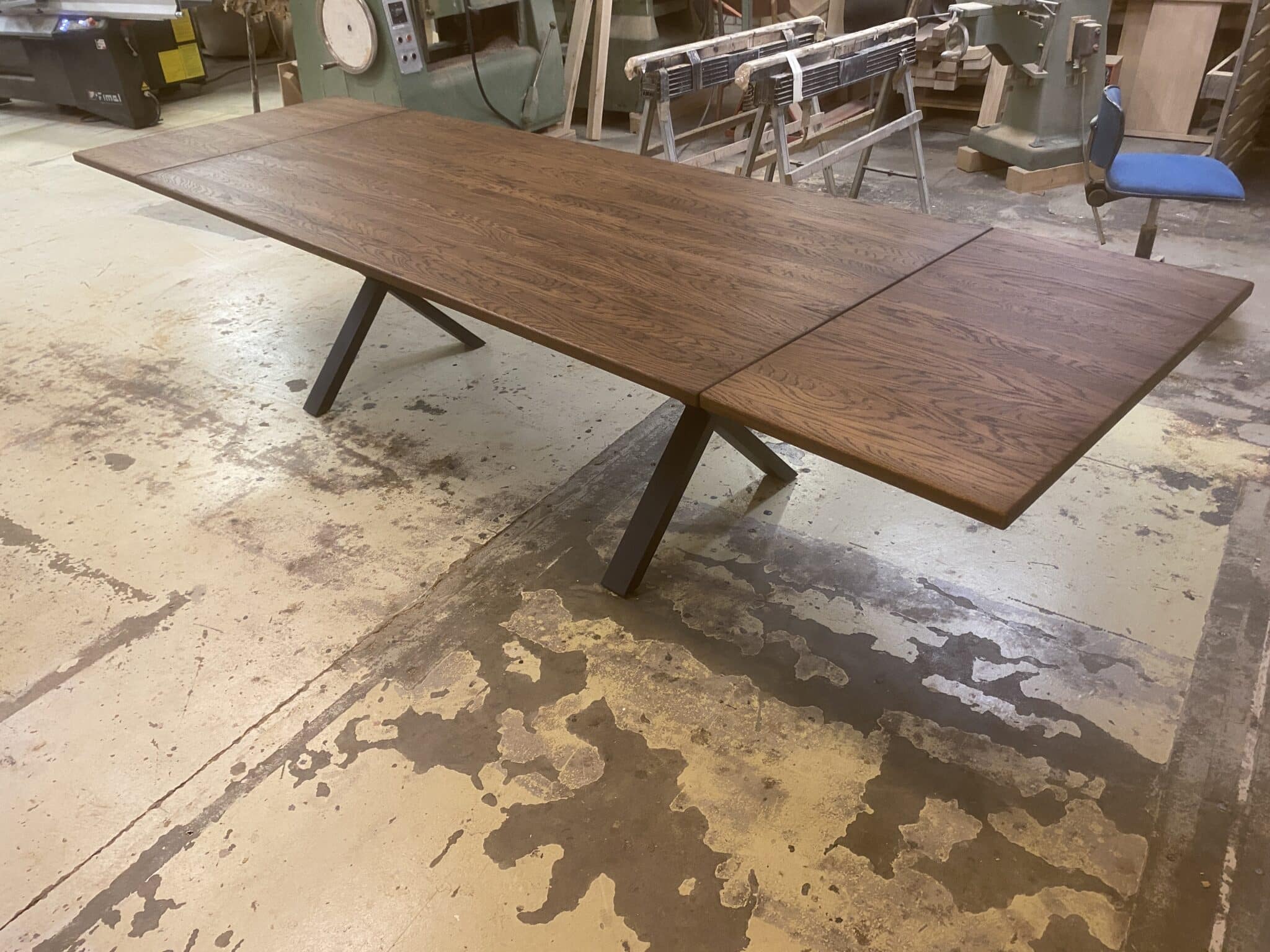 Fint bord stavlimet eg røget olieret . Der medfølger 2 tillægsplader L 324/220 cm B 100 cm T 3 cm .
